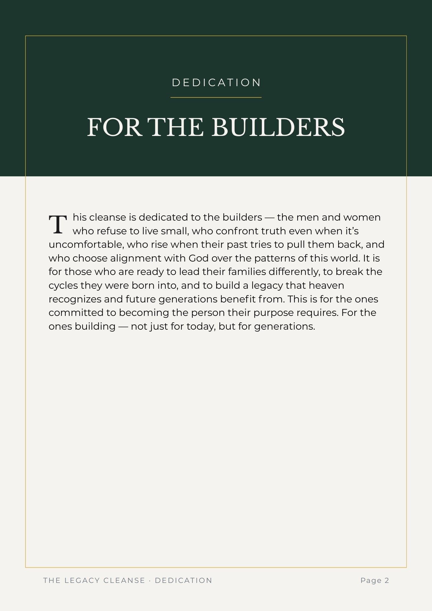 The Legacy Cleanse was created for builders — men and women who refuse to live small, who are ready to break cycles, lead differently, and build a legacy Heaven recognizes.